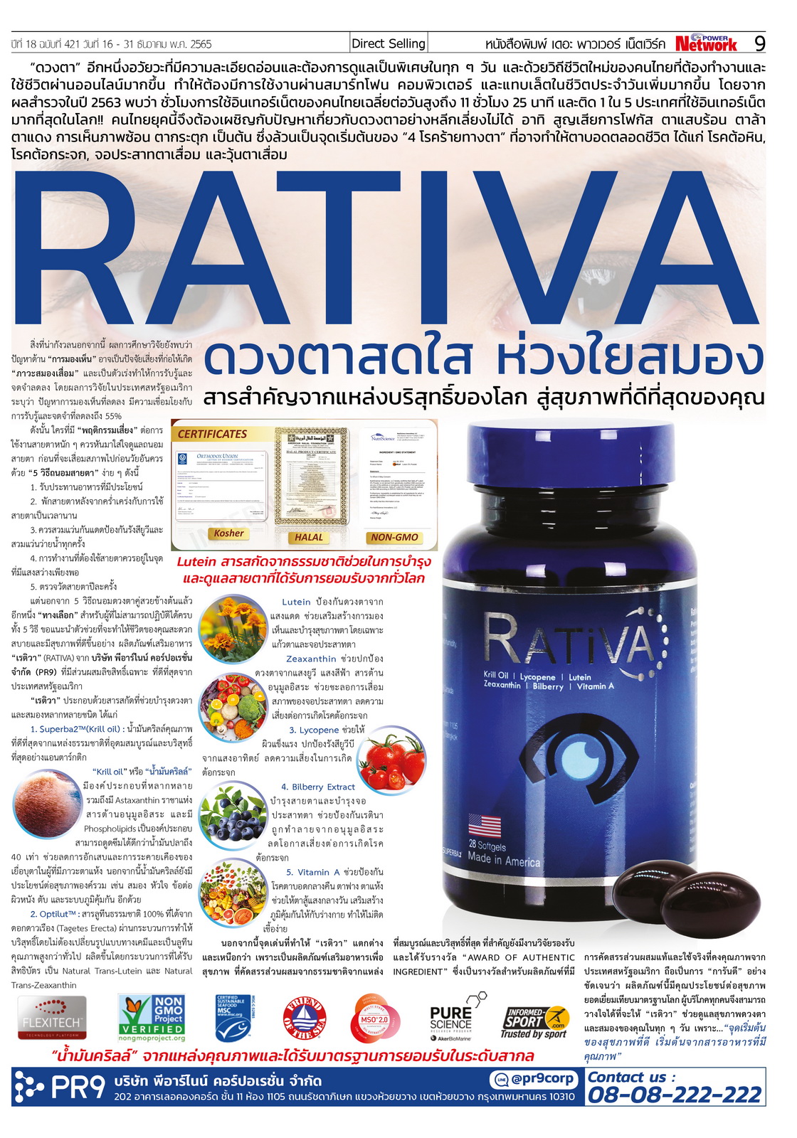 แต่นอกจาก 5 วิธีถนอมดวงตาคู่สวยข้างต้นแล้ว อีกหนึ่ง “ทางเลือก” สำหรับผู้ที่ไม่สามารถปฏิบัติได้ครบทั้ง 5 วิธี ขอแนะนำตัวช่วยที่จะทำให้ชีวิตของคุณสะดวกสบายและมีสุขภาพที่ดีขึ้นอย่าง ผลิตภัณฑ์เสริมอาหาร “เรติวา” (RATIVA) จาก บริษัท พีอาร์ไนน์ คอร์ปอเรชั่น จำกัด (PR9) ที่มีส่วนผสมลิขสิทธิ์เฉพาะ ที่ดีที่สุดจากประเทศสหรัฐอเมริกา