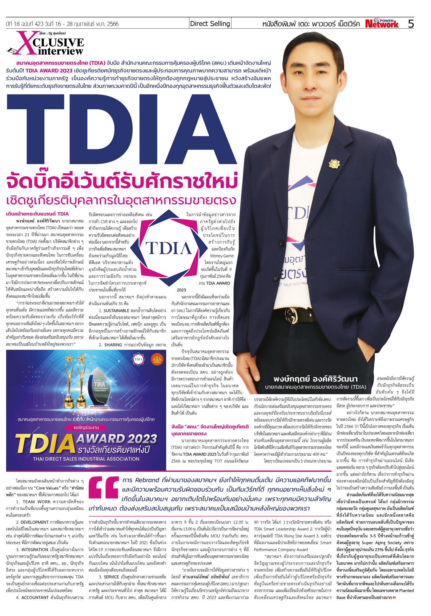 นายกสมาคมอุตสาหกรรมขายตรงไทย (TDIA) กล่าวต่อว่า กิจกรรมสำคัญต้นปีนี้ คือ การจัดงาน TDIA AWARD 2023 ในวันที่ 9 กุมภาพันธ์ 2566 ณ หอประชุมใหญ่ TOT ถนนแจ้งวัฒนะ อาคาร 9 ชั้น 2 เริ่มลงทะเบียนเวลา 12.00 น. เริ่มงาน 13.00 น. เป็นต้นไป ว่า ถือเป็นการจัดงานใหญ่ครั้งแรกของปีนี้หลังเซ็นต์ MOU ร่วมกันกับ สคบ. ภายในงานจะมีการมอบรางวัลและเชิดชูเกียรตินักธุรกิจขายตรง และผู้ประกอบการต่างๆ ที่มีส่วนสำคัญในการขับเคลื่อนอุตสาหกรรมขายตรงไทยและเศรษฐกิจของประเทศ