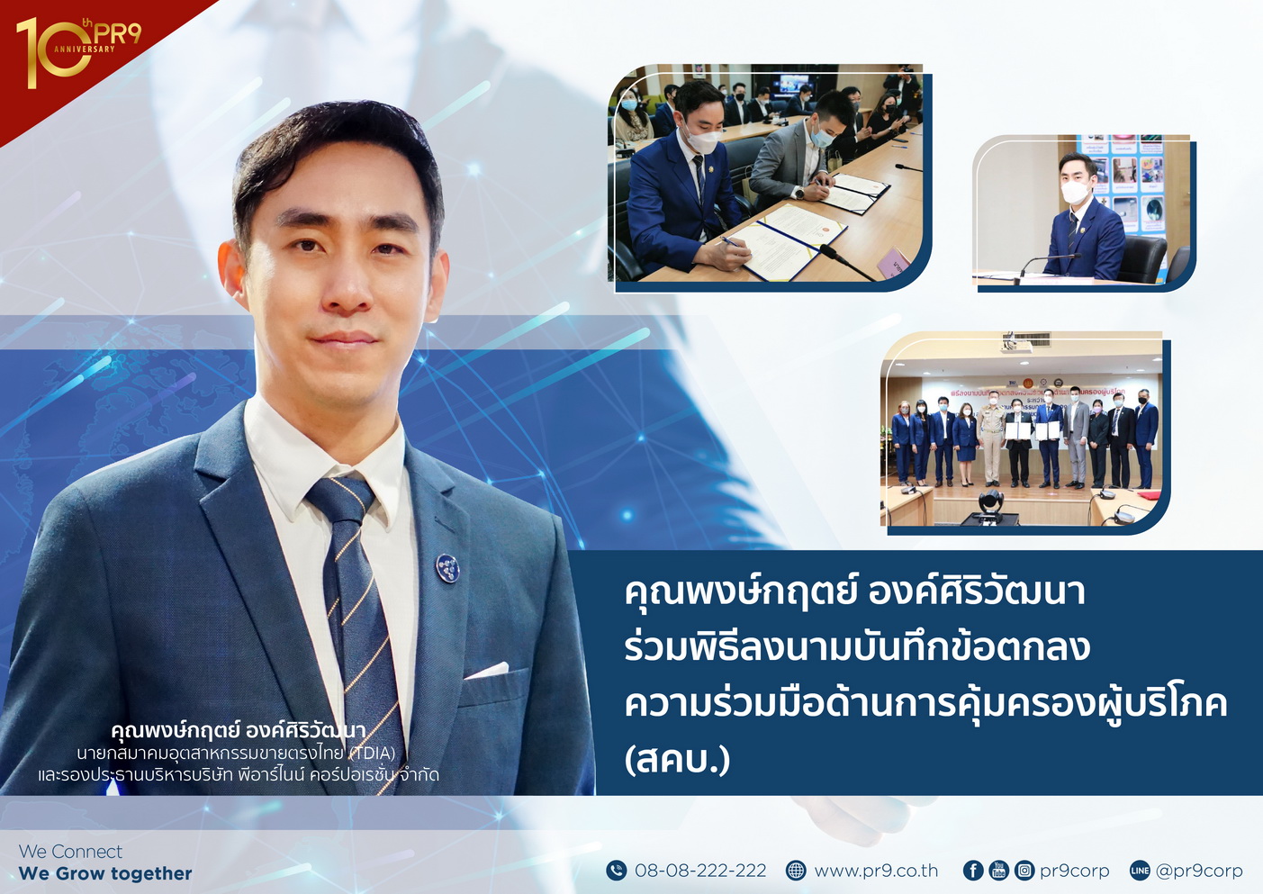คุณพงษ์กฤตย์ องค์ศิริวัฒนา นายกสมาคมอุตสาหกรรมขายตรงไทย (TDIA) และรองประธานบริหารบริษัท พีอาร์ไนน์ คอร์ปอเรชั่น จำกัด ร่วมพิธีลงนามบันทึกข้อตกลงความร่วมมือด้านการคุ้มครองผู้บริโภค กิจกรรม การสร้างความร่วมมือการคุ้มครองผู้บริโภค ของภาคีเครือข่ายภาครัฐ ภาคเอกชน และภาคประชาสังคม ในวันพุธที่ 20 เมษายน 2565 ได้มีพิธีลงนามบันทึกข้อตกลงความร่วมมือด้านการคุ้มครองผู้บริโภคระหว่าง สำนักงานคณะกรรมการคุ้มครองผู้บริโภค กับ สมาคมอุตสาหกรรมขายตรงไทย (TDIA), สมาคมการขายตรงไทย (TDSA), และ สมาคมทีวีโฮมช้อปปิ้ง(ประเทศไทย) โดย นายธสรณ์อัฑฒ์ ธนิทธิพันธ์ (เลขาธิการคณะกรรมการคุ้มครองผู้บริโภค) เพื่อการบูรณาการด้านการคุ้มครองผู้บริโภค และ การเกาะติดสถานการณ์การคุ้มครองผู้บริโภคในยุคสื่อออนไลน์..
